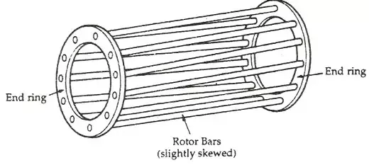 The rotor, which is the moving part of the motor, consists of conductive bars, often made of aluminum or copper, which interact with the rotating magnetic field. These conductive bares are arrange similar to a classic squirrel cage, hence the rotor are often referred to as the squirrel cage, check out the picture below for a better understanding: